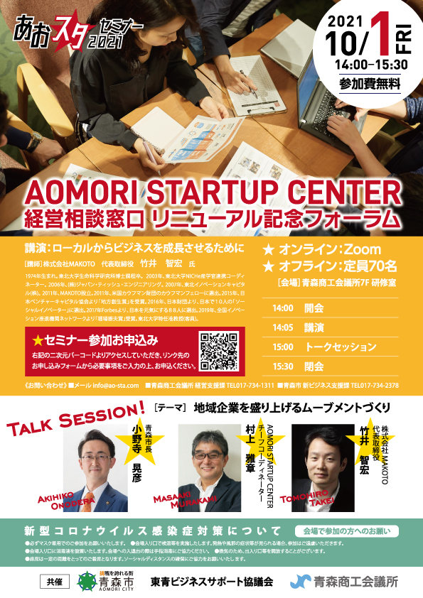 今回はAOMORI STARTUP CENTER経営相談窓口リニューアルを記念して、講演・トークセッションを行います。