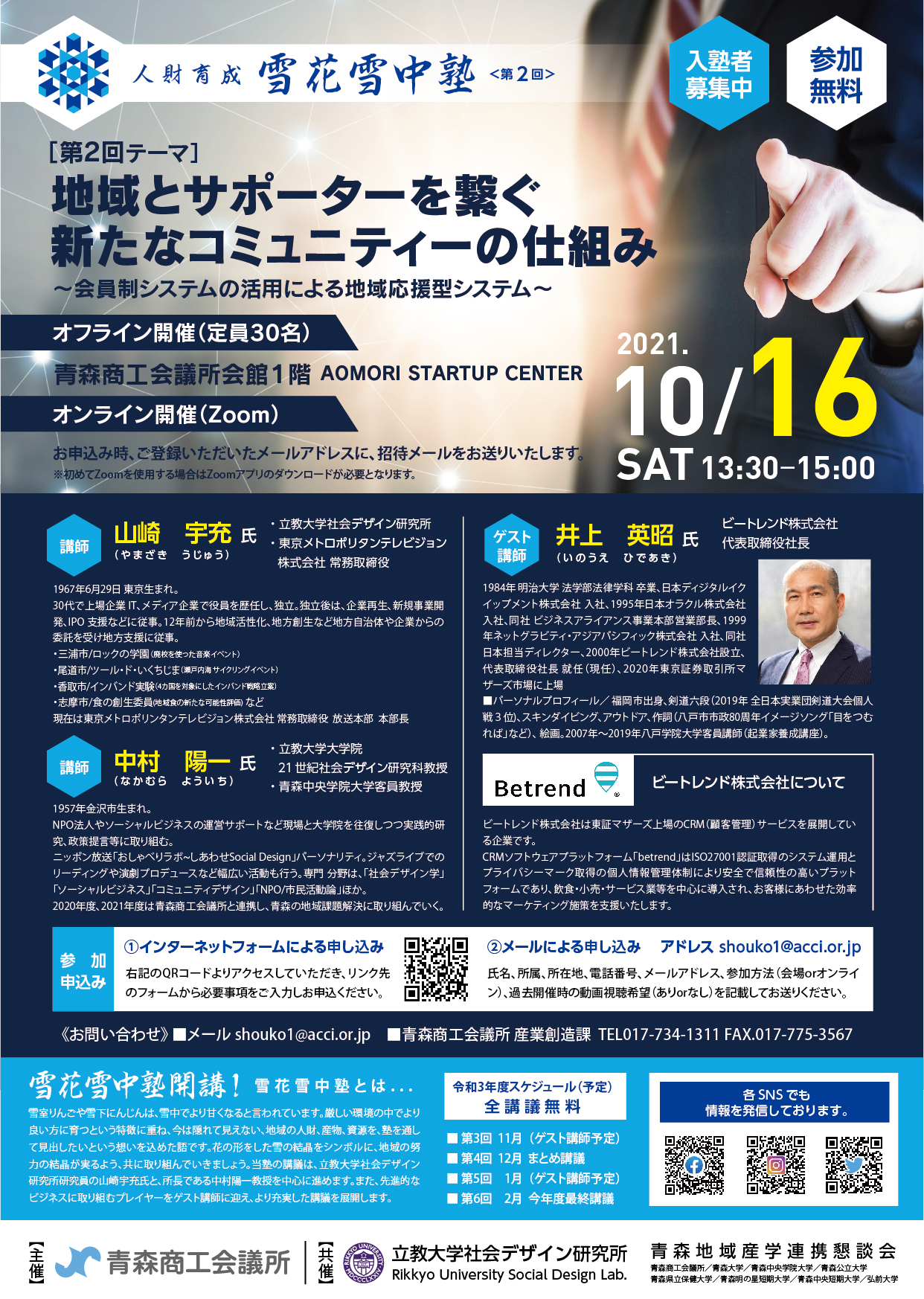 青森商工会議所では、立教大学社会デザイン研究所との連携のもと、社会・地域課題の解決について、対話や講義を通じ、共に学び、考える場を作り、新ビジネスや地域おこしに取り組んでいく人財が育つよう、同研究所所長の中村陽一教授、研究員の山崎宇充氏をコーディネーターに「人財育成塾 雪花雪中塾」を開催しています。
