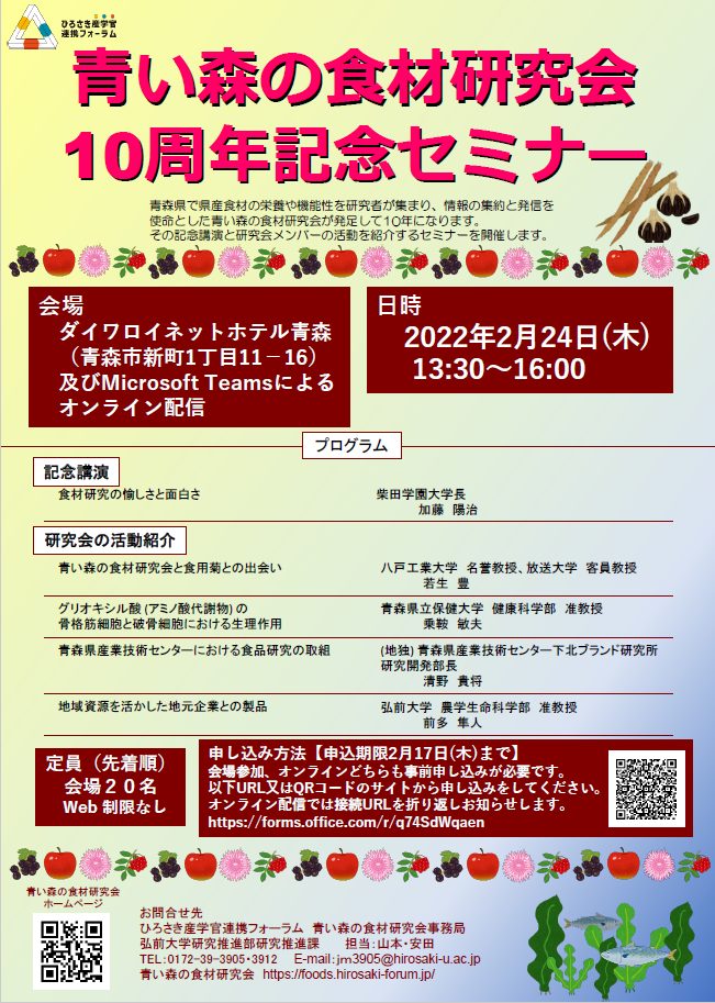 TEL.0172-39-3905・3912 E-mail.jm3905@hirosaki-u.ac.jp 青い森の食材研究会 https://foods.hirosaki-forum.jp/