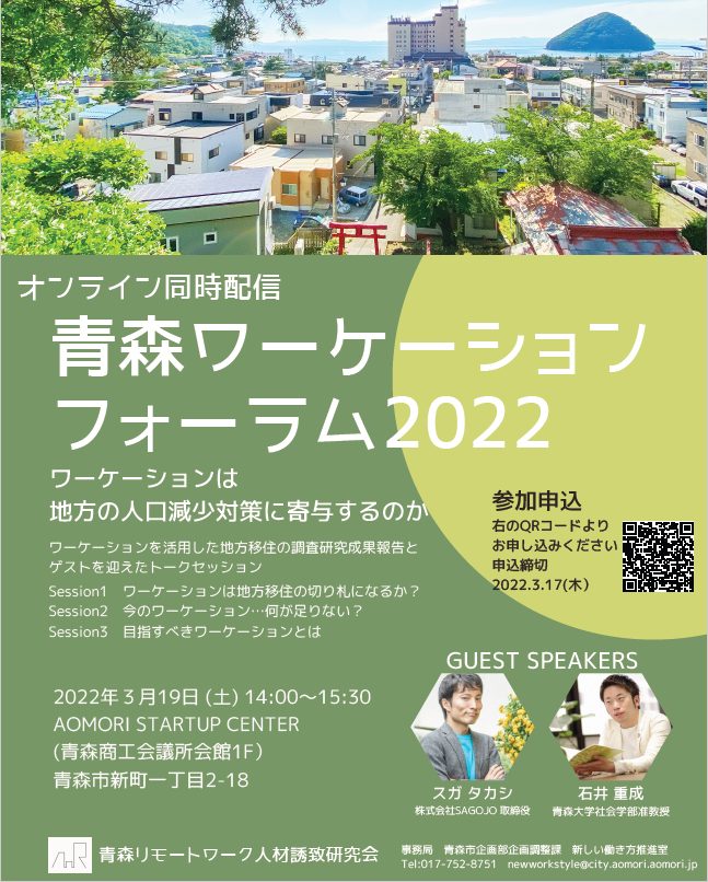 その研究成果を報告するとともに、今後ワーケーションが地方の人口減少対策に寄与するのか、青森市・青森圏域はどのような事業に取り組むべきなのか、ゲストを迎えトークセッションを行います。