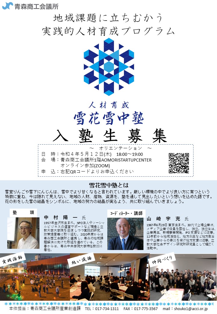 青森商工会議所では、社会・地域課題の解決について、対話や講義を通じ、共に学び、考える場を作り、新ビジネスや地域おこしに取り組んでいく人財が育つよう、青森中央学院大学特任教授の中村陽一氏を塾頭に、立教大学社会デザイン研究所研究員の山崎宇充氏をコーディネーターに「人財育成塾 雪花雪中塾」を昨年度に引き続き、6月から月1回程度開催することといたしました。
