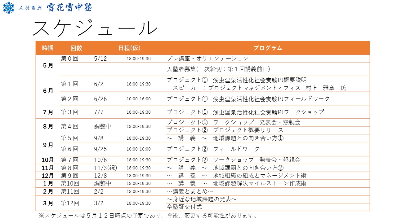 令和4年5月12日、本年度「雪花雪中塾」のオリエンテーションを開催させていただき、年間を通して参加いただく塾生の募集を開始させていただきました。地域課題や地域活性化を自分事とする意欲のある方のご参加をぜひお待ちしております!