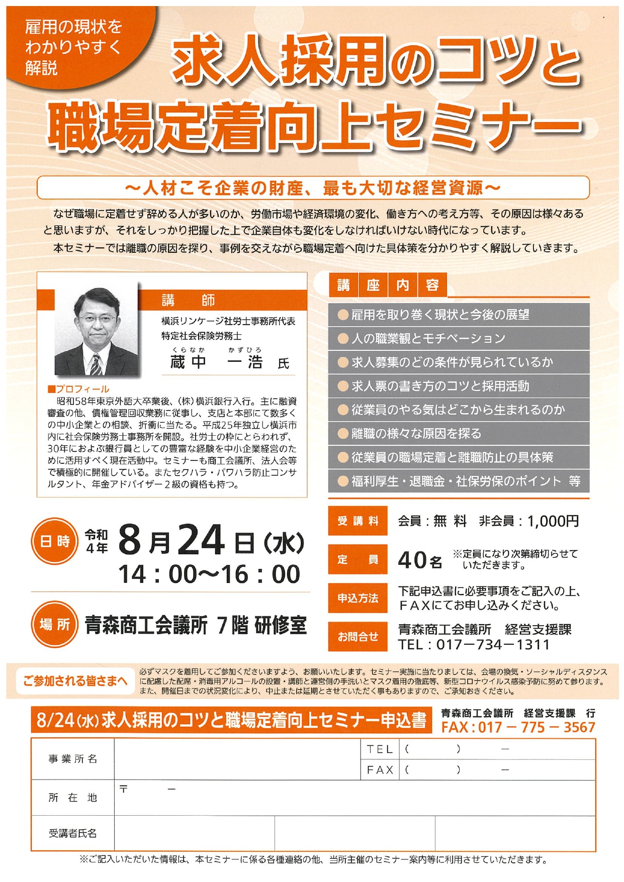 申込書のダウンロードはコチラ→「求人採用のコツと職場定着向上セミナー申込書」