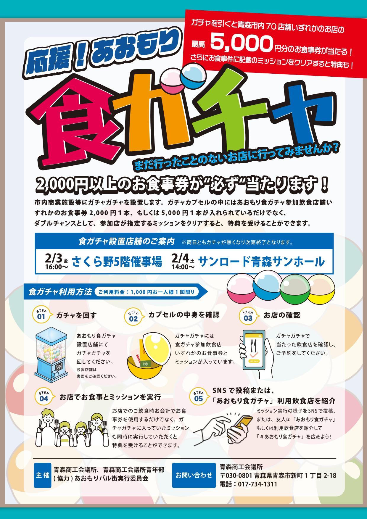 青森商工会議所と青森商工会議所青年部では2月3日・4日に市内商業施設にガチャガチャを設置します。1回1,000円のガチャを回すと、あおもり食ガチャ参加飲食店舗いずれかのお食事券が当たります。お食事券は外れなしで、2,000円以上のお食事券が”必ず”当たります!