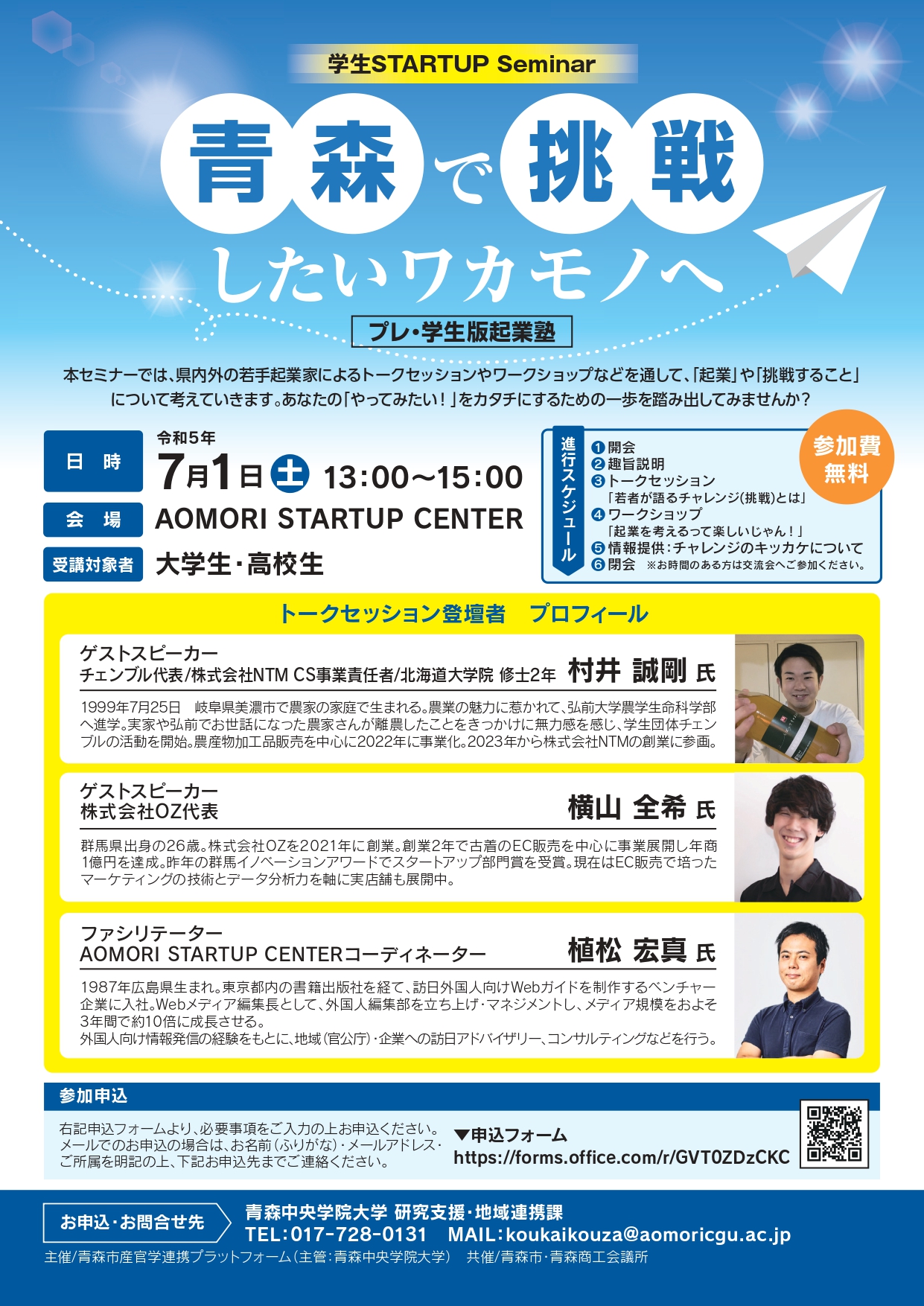 青森市産官学連携プラットフォーム(本件主管:青森中央学院大学)による『学生STARTUP Seminar~青森で挑戦したいワカモノヘ~ 開催のお知らせ』(チラシ)が開催されます。
