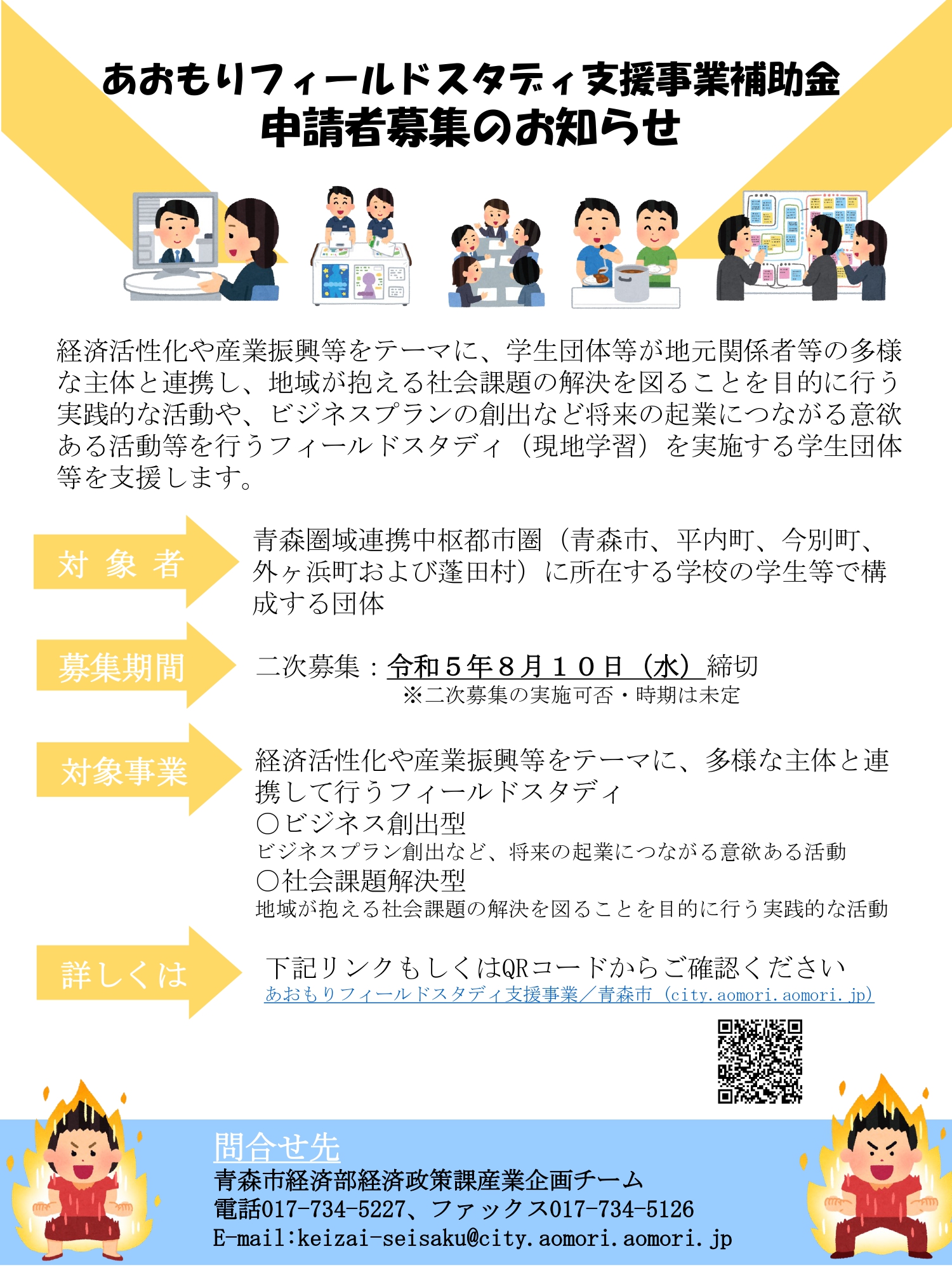 青森市では、経済活性化や産業振興等をテーマに、学生団体等が地元関係者等の多様な主体と連携し、地域が抱える社会課題の解決を図ることを目的に行う実践的な活動や、ビジネスプランの創出など将来の起業につながる意欲ある活動等を行うフィールドスタディ(現地学習)に対し支援を行う「あおもりフィールドスタディ支援事業補助金」を下記の通り実施し、申請団体を募集しております。