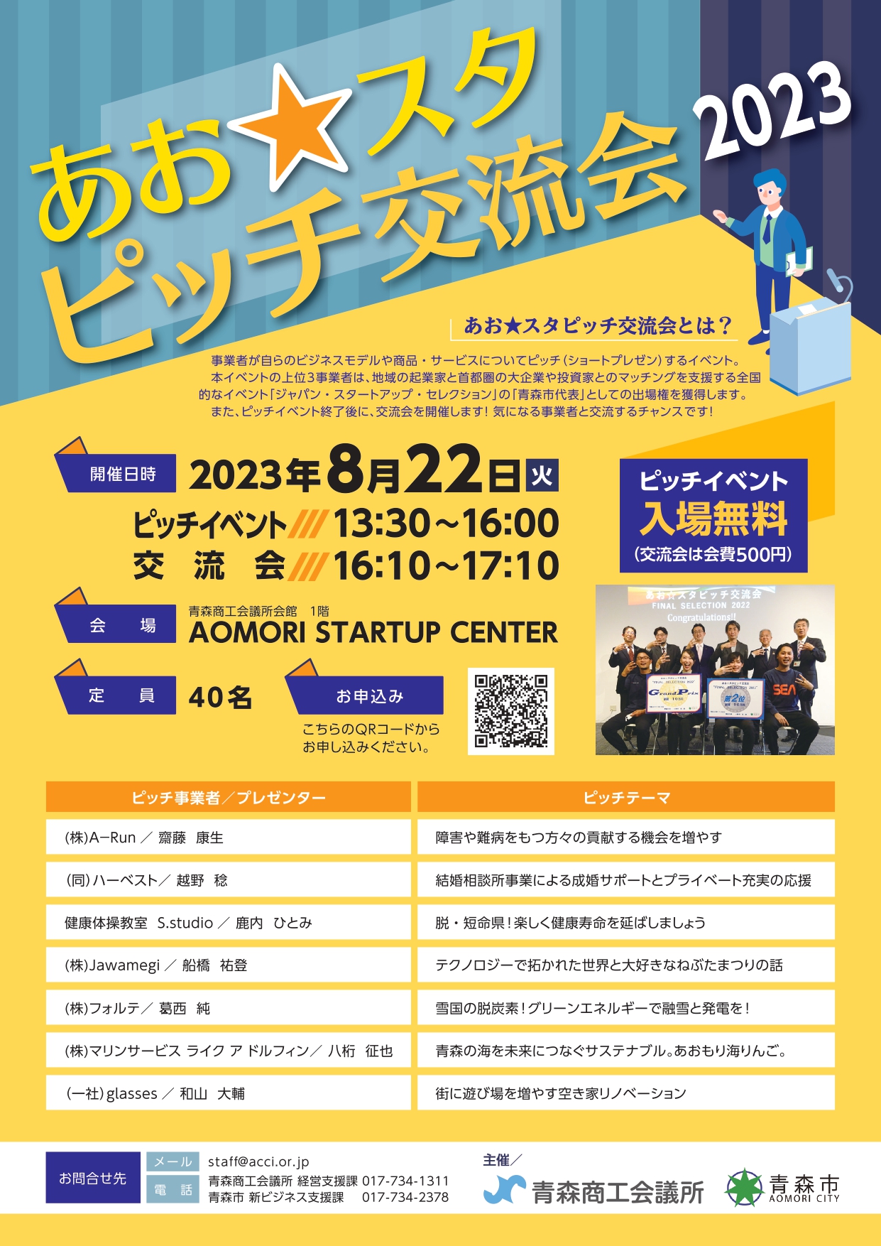 当所は、青森市をはじめとする関係機関と連携し、地域の起業・創業の機運醸成を図るため、起業した事業者のビジネスモデルや事業内容(商品・サービス)を、事業者自らピッチによりPRする、「あおスタピッチ交流会」を開催いたします!