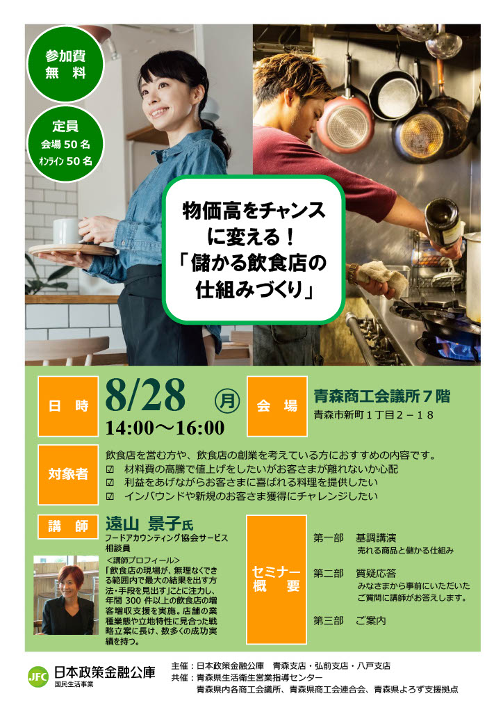日本政策金融公庫では、飲食店を営む方や、飲食店の創業を考えている方向けに「儲かる飲食店の仕組みづくり」セミナーを下記の通り開催いたします。