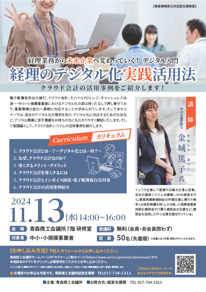 電子帳簿保存法の施行、クラウド会計、モバイルPOS レジ、キャッシュレス決済・・・中小・小規模事業者におけるデジタル化の波は待ったなしで押し寄せており、事業環境の変化へ柔軟に対応することが求められています。そこで本セミナーでは、自社のデジタル化の現状を知り、デジタル化に対応するための方法など、デジタル関連に苦手意識をお持ちの方にもわかりやすく解説いたします。そして実践編として、クラウド会計システムを実際に活用してデモンストレーションを体験していただきます。
