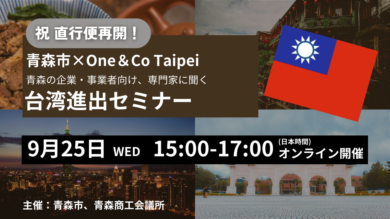 青森市と台湾を結ぶ直行便の再開を祝して、台湾市場への進出を検討している青森の企業や事業者を対象に、JR東日本グループが運営する台湾のコワーキング施設「One&Co Taipei」と連携し、青森市内の企業にビジネスチャンスを広げる場と機会を提供するとともに、現地で活躍する日系企業や台湾進出を支援している事業者から、台湾市場についてのリアルな情報を聞くオンラインイベントを開催します。