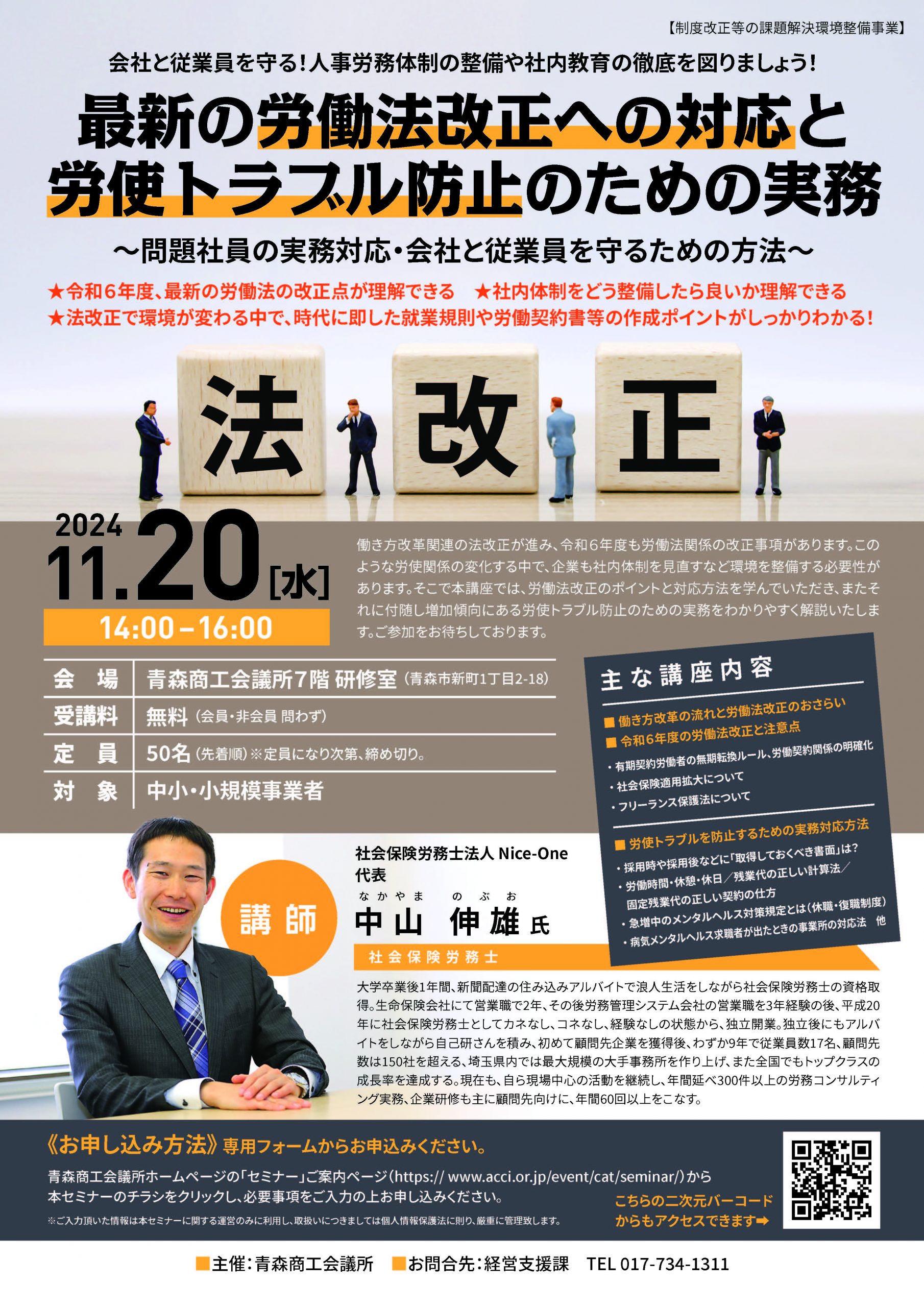 働き方改革関連の法改正が進み、令和6年度も労働法関係の改正事項があります。このような労使関係の変化する中で、企業も社内体制を見直すなど環境を整備する必要性があります。そこで本講座では、労働法改正のポイントと対応方法を学んでいただき、またそれに付随し増加傾向にある労使トラブル防止のための実務をわかりやすく解説いたします。ご参加をお待ちしております。