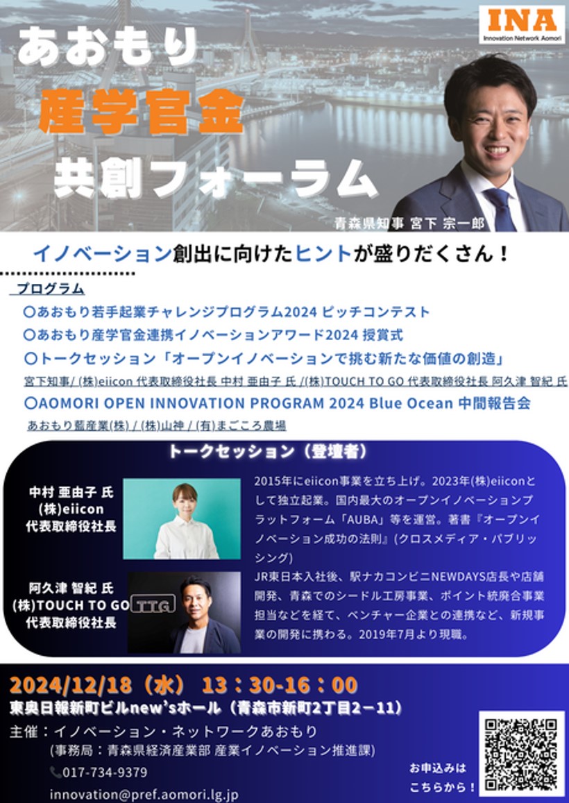 青森県内の横断的な産学官金のネットワーク「イノベーション・ネットワークあおもり」(代表:青森県知事、事務局:青森県経済産業部産業イノベーション推進課)では、本県のイノベーション創出に向けた機運を高めることを目的に、来る12月18日(水)に、「あおもり産学官金共創フォーラム」を開催します。