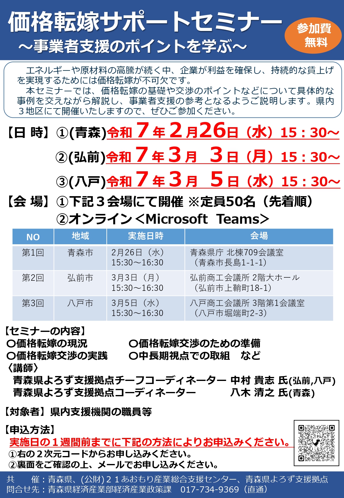 ※チラシの【対象者】に県内支援機関の職員等と記載がございますが、事業者の方も参加できます。価格転嫁の交渉の準備や実践など事業者の方にとっても参考となる内容となっておりますので、ぜひお申し込みください。