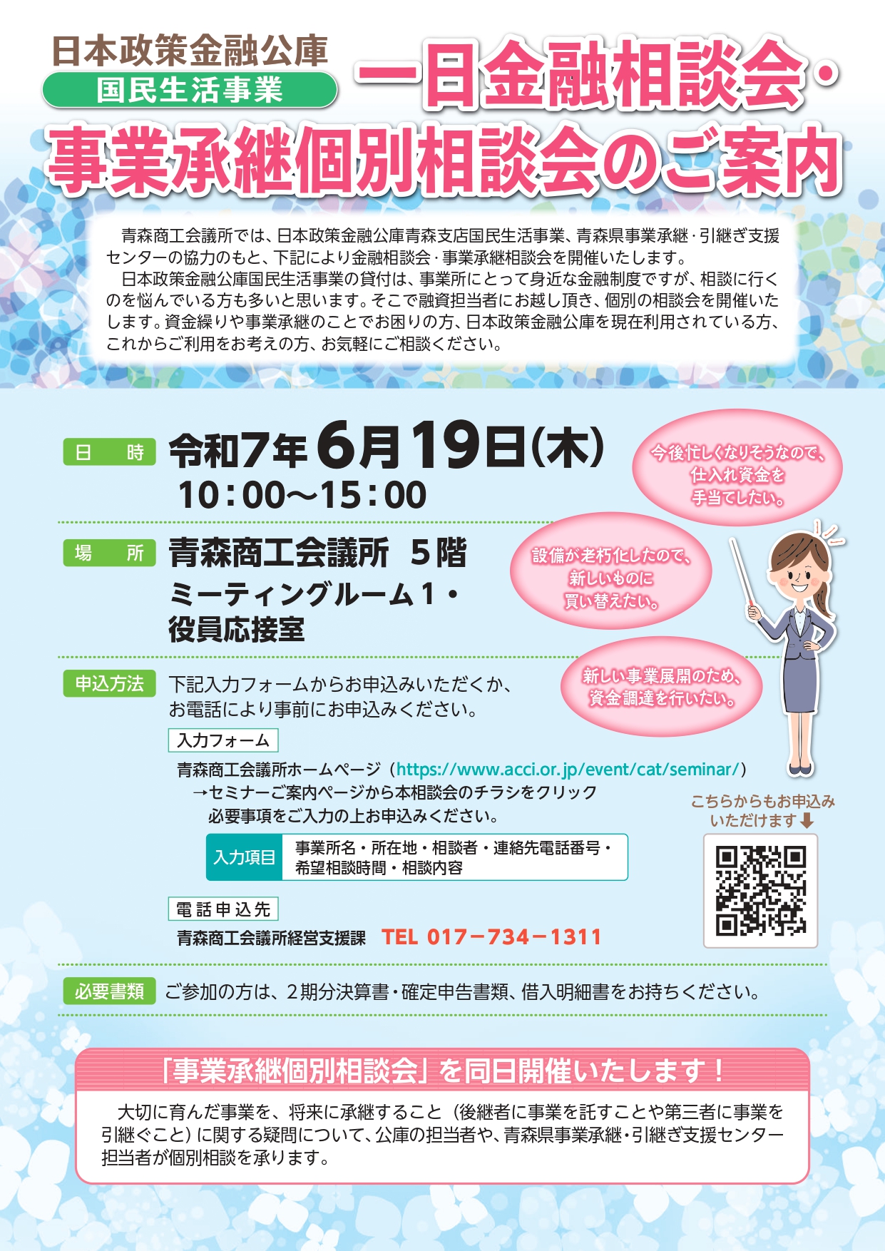 日本政策金融公庫青森支店国民生活事業、青森県事業承継・引継ぎ支援センターの協力のもと、下記により金融相談会・事業承継相談会を開催いたします。