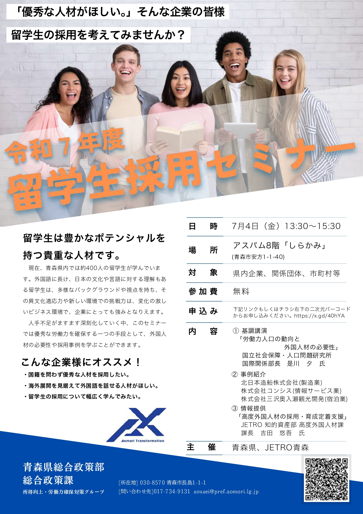 県内企業の人材確保を支援するため、外国人留学生の採用についての理解促進等を目的としたセミナーを下記のとおり開催いたします。