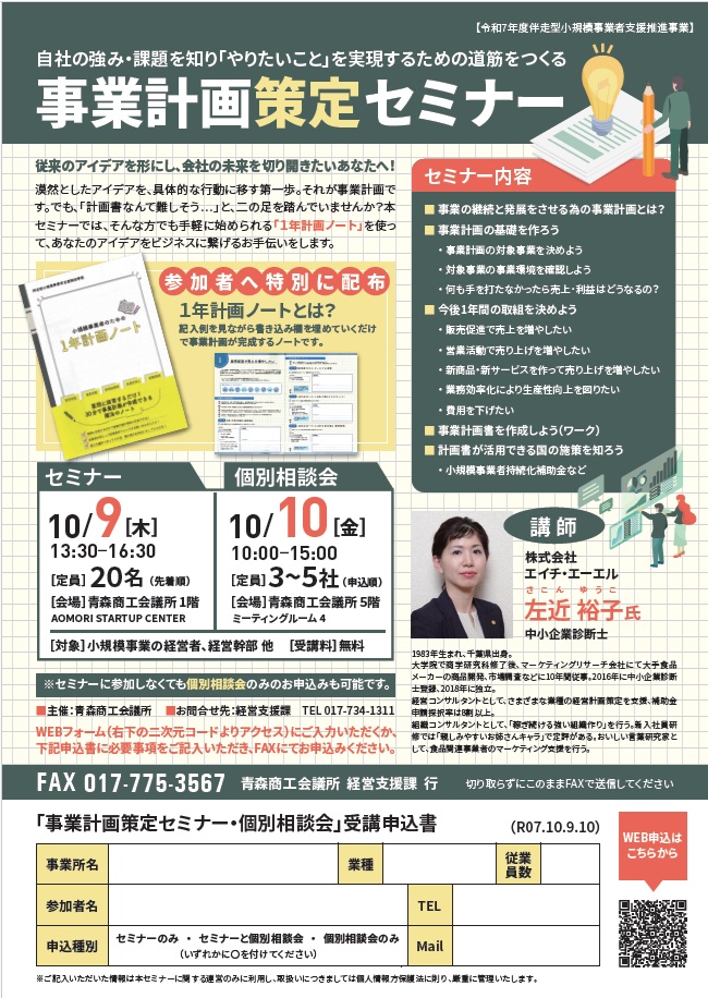 FAX申込:017-775-3567 青森商工会議所 経営支援課 行 2025事業計画セミナーチラシ