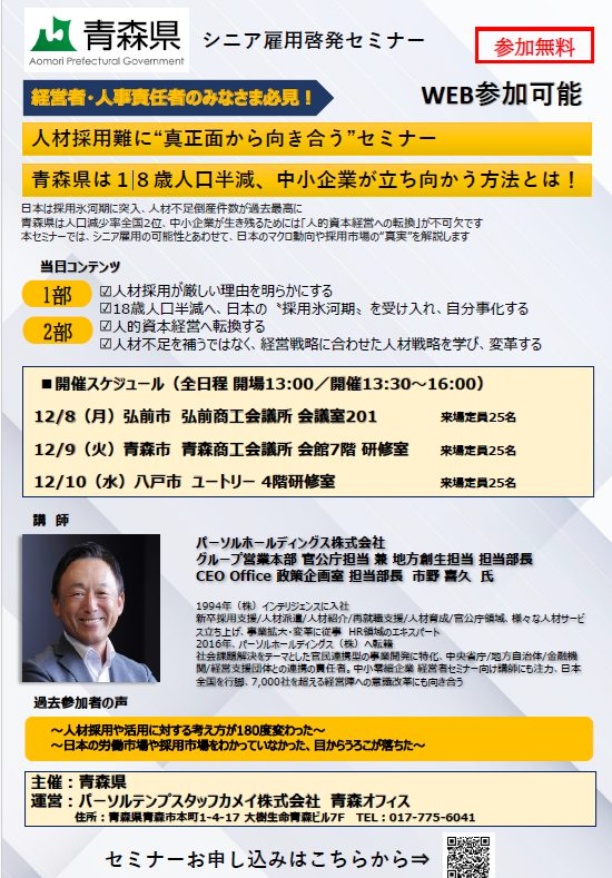 ・青森市-12月9日(火)13:30~16:00 青森商工会議所 7階研修室(青森市新町1丁目2-18)