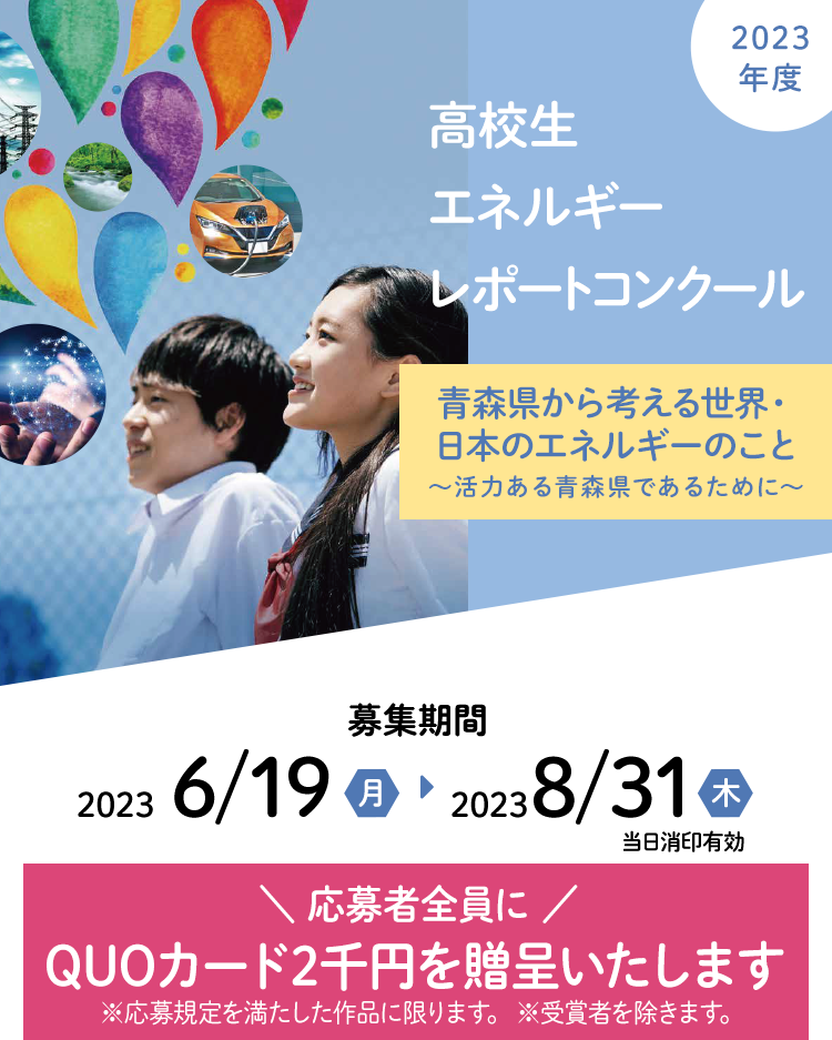 エネルギーは私たちの経済・社会生活を支える大切なものであり、その利用は地球環境の保全に大きな関わりを持っています。日本はエネルギー資源に乏しく、他国と電力系統等のネットワークが構築されていないため、エネルギー資源の殆どを海外からの輸入に頼っており、資源が豊富な国と比較して、エネルギーの安定供給が重要です。さらに、昨今の国際情勢が不安定な状況を受け、国内電力の需給逼迫が深刻化しております。加えて、2050年までに温室効果ガスの排出を全体としてゼロにする「カーボンニュートラル」の実現に向け国を挙げて挑戦している中、青森県は省エネルギーの推進はもとより、再生可能エネルギーの導入推進や原子力関連施設の立地協力、エネルギー関連産業の振興等に取り組んでおり、重要な役割を期待されています。このようにエネルギー問題は、次世代を担う高校生の皆さんに真剣に考え、そして議論していただきたい重要な課題です。特に、レポートの中で取り上げていただく論点の一例として、①青森県内に多数立地する原子力関連施設の日本における位置づけ・将来の役割、②再生可能エネルギー、原子力等を含めた適切なエネルギーミックスの構築に向けて求められるもの、③カーボンニュートラル実現に向けて求められるエネルギーとは、など3つの視点から分析し、自分の言葉で考えや思いを述べてください。
